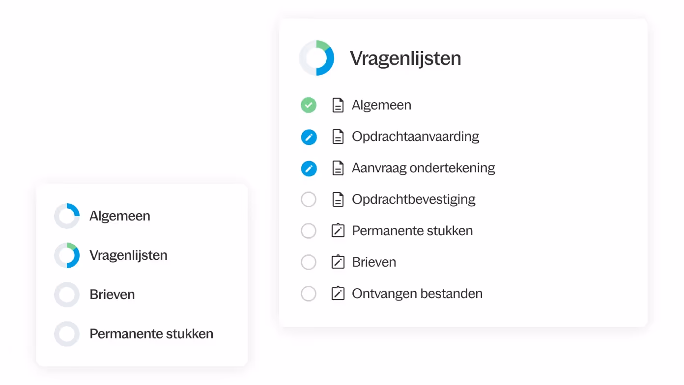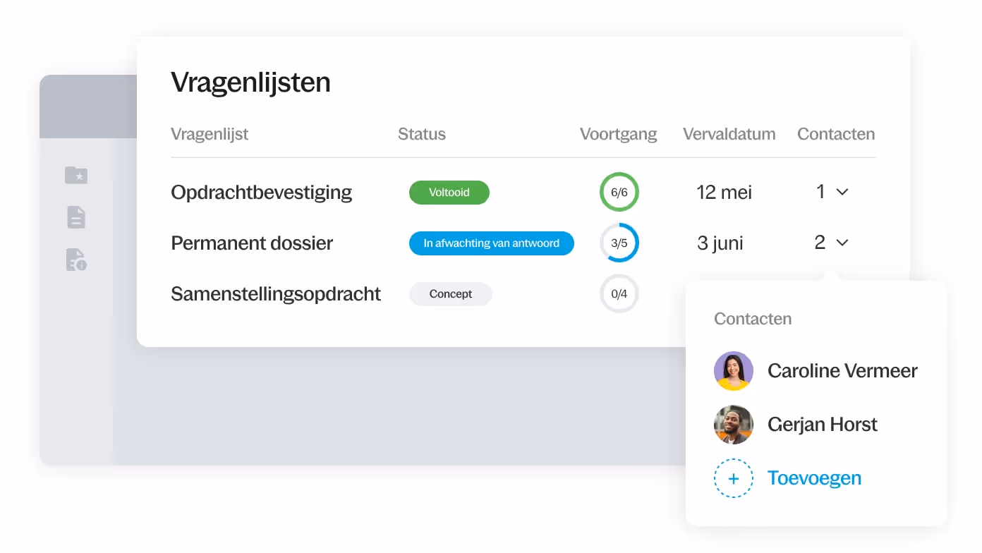 Met een gestandaardiseerde set vragen, die opdrachtspecifiek kan worden gemaakt, krijg je alle benodigde klantinformatie op één plek beschikbaar. Klanten zien wat ze moeten opleveren en stukken worden automatisch gesorteerd.