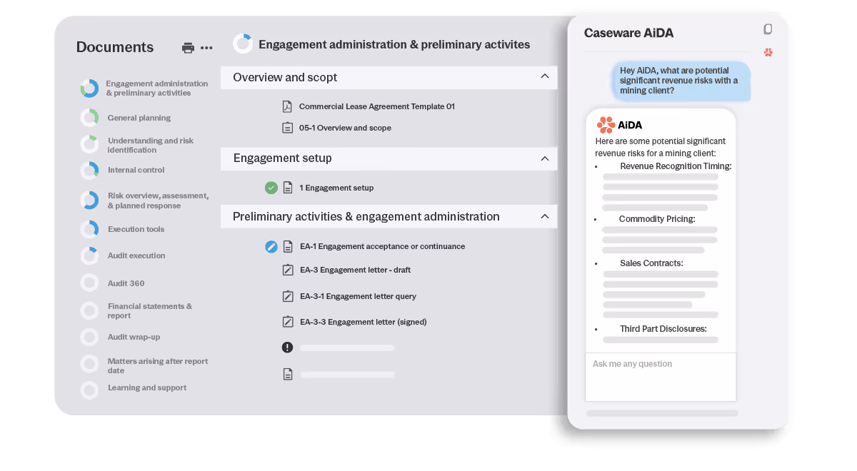 AI that establishes engagement context early through Caseware AiDA, the digital assistant that surfaces the right methodology, applicable standards and firm guidance based on where the team is in the workflow.