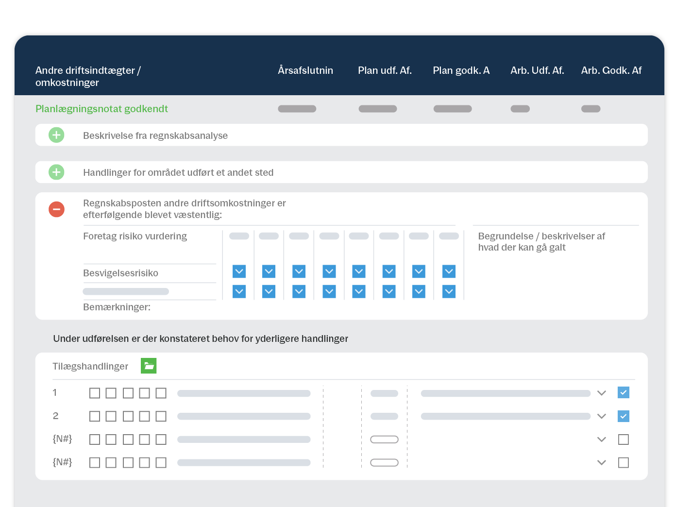 Modulet er opbygget af procedurer og arbejdsgange, der trin for trin guider dig gennem processen. Det sikrer en effektiv og dynamisk arbejdsproces og giver et naturligt flow i alle faser fra planlægning til afslutning. Modulet omfatter alle de forhold, der skal håndteres og dokumenteres i henhold til lovgivning og internationale standarder. Modulet kan håndtere alle filtyper, og du kan nemt knytte dokumentation til blandt andet handlinger, regnskabsposter og opfølgningspunkter.