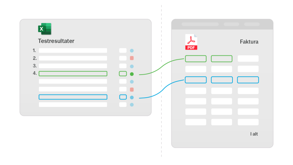 Klik på udtrukne data i Excel for øjeblikkeligt at navigere tilbage til kildedokumentet. Gennemse understøttende dokumentation uden at skifte mellem flere skærme eller filer. Indarbejd et struktureret workflow til test med indbyggede godkendelser og gennemgange.