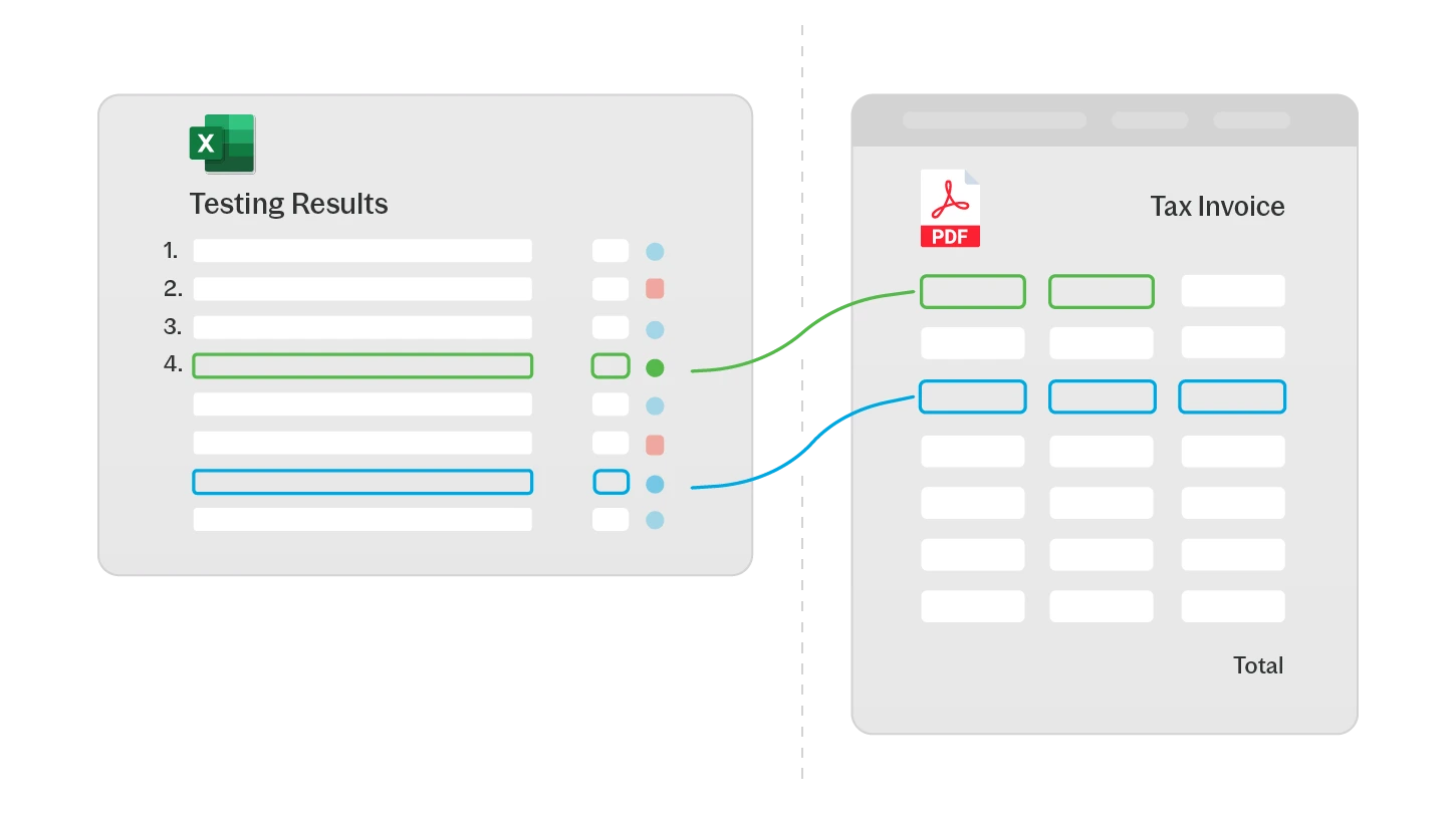 Valide al instante los importes de las facturas, los nombres de los proveedores y la coherencia numérica entre los documentos. Localice discrepancias y asegure la precisión sin tener que buscar manualmente en varios archivos PDF. Realice pruebas de muestras grandes a la vez, ahorrando tiempo en pruebas de confirmación de gran volumen.