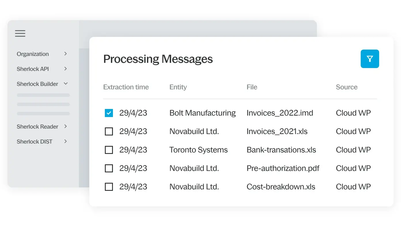Sherlock automatiza por completo el proceso de extracción de datos de sus encargos, cargándolos en una base de datos centralizada y convirtiéndolos en un formato que le permita analizar fácilmente los datos de todos los encargos para obtener información sobre la empresa. Se acabó la manipulación e introducción de datos manual, que consumía tiempo y limitaba la integridad de los datos.