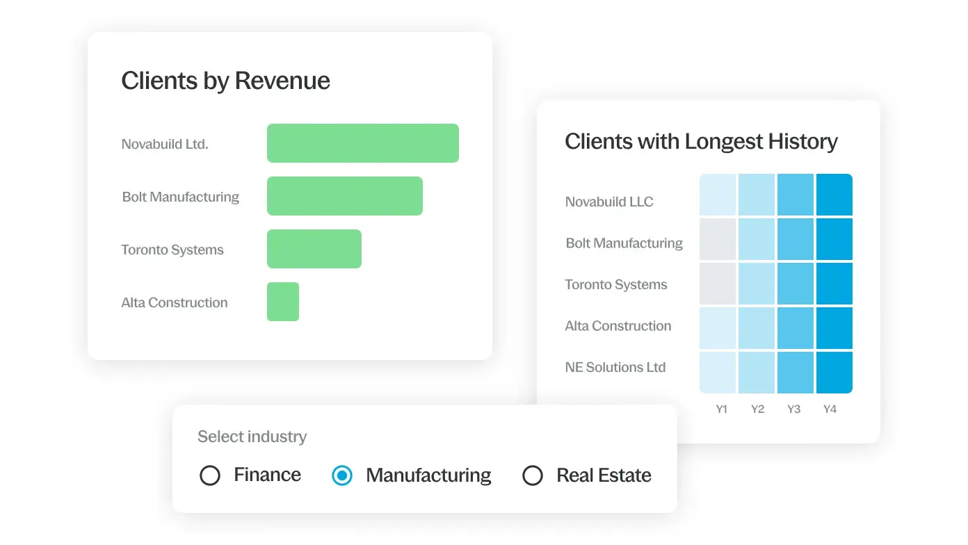Haga perfiles de sus clientes sobre puntos de datos clave para identificar oportunidades de ofrecer servicios de asesoramiento a clientes, además de adquirir un conocimiento más profundo de sus finanzas para analizar tendencias año tras año. Compare los datos de un cliente con los de otros del mismo sector para sugerir vías de crecimiento.