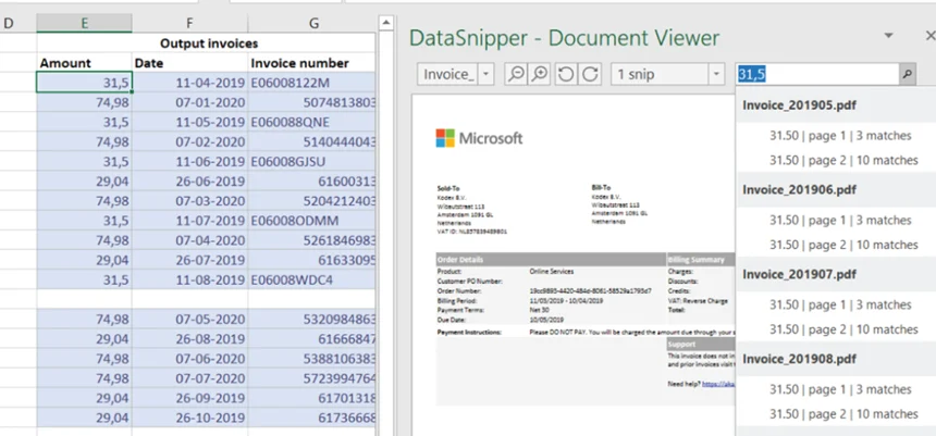 De tekstherkenning kan je niet alleen gebruiken om snel gegevens uit bestanden te kopiëren, het werkt ook andersom. Ben je op zoek naar de factuur die bij een transactie hoort? Klik op een cel in Excel, bijvoorbeeld het bedrag, en DataSnipper zoekt door de geüploade bestanden en vist voor jou de juiste factuur uit de stapel.