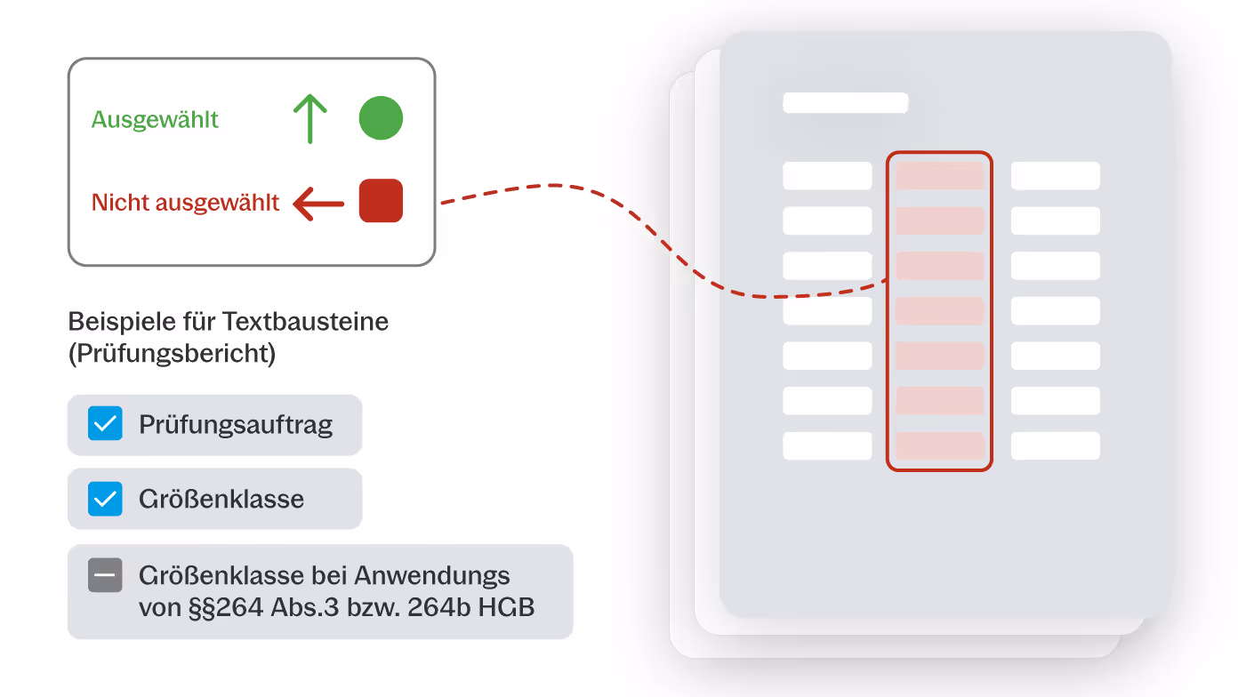 Große Bibliothek mit frei wählbaren Textbausteinen für Prüfungs- und Erstellungsberichte, die sich flexibel an Kanzlei- oder Mandantenanforderungen anpassen lassen.