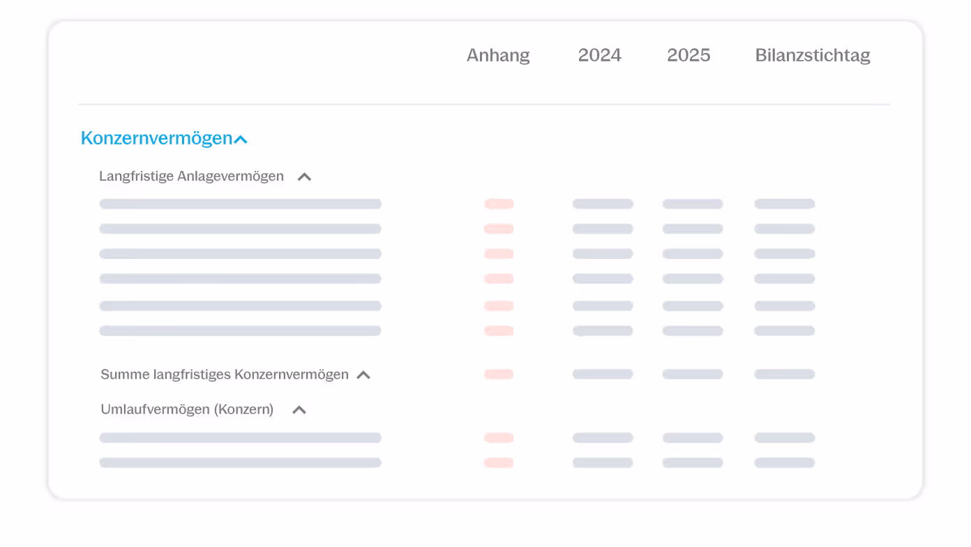 Unterstütztunterschiedliche Gliederungsschemata inkl. Konzernbericht.