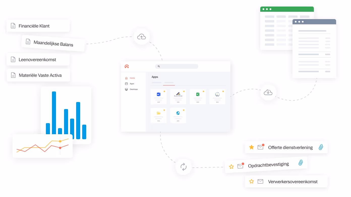 Doordat data en applicaties niet lokaal staan, ben je niet afhankelijk van één pc. Log in waar je ook bent en werk 24/7 verder op laptop of ander device.