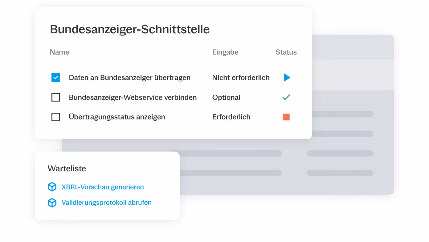 Steuert die Erstellung und Übermittlung von Jahresabschlüssen, GuV und ergänzenden Berichten im amtlich vorgegebenen XBRL-Format für die Offenlegung beim Bundesanzeiger oder im Unternehmensregister.